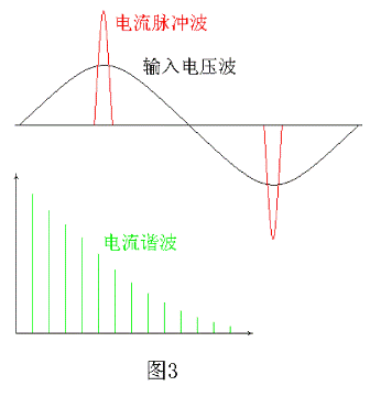 一般電容器C5 的容量很大,其兩端電壓紋波很小,大約只有輸入電壓的10%左右,而僅當(dāng)輸入電壓Ui大于電容器C5 兩端電壓的時候,整流二極管才導(dǎo)通,因此在輸入電壓的一個周期內(nèi),整流二極管的導(dǎo)通時間很短,即導(dǎo)通角很小。這樣整流電路中將出現(xiàn)脈沖尖峰電流,如圖3 所示。