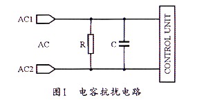 為防止控制板電路產(chǎn)生的傳導干擾,可在電路的進人口(即AC兩端)并接上一個電容C,圖1所示是一個簡單的電容抗擾電路連接圖。圖中的電容屬于安全電容,但必須在該電容的兩端并聯(lián)一個安全電阻,以用于防止電源線拔插時電源線插頭長時間帶電。因為安全標準規(guī)定,當正在工作之中的機器電源線被拔掉時,在兩秒鐘內(nèi),電源線插頭兩端所帶的電壓(或?qū)Φ仉娢?必須小于原來電壓的30%。