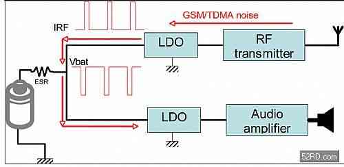 防止GSM噪聲降低音頻質量的最佳方法,就是使用具有很低壓降(LDO)和低輸出噪聲的線性穩壓器(LR)從鋰離子電池直接給音頻放大器供電。這種LDO線性穩壓器用作放大器電源的“清理”或濾波模塊。