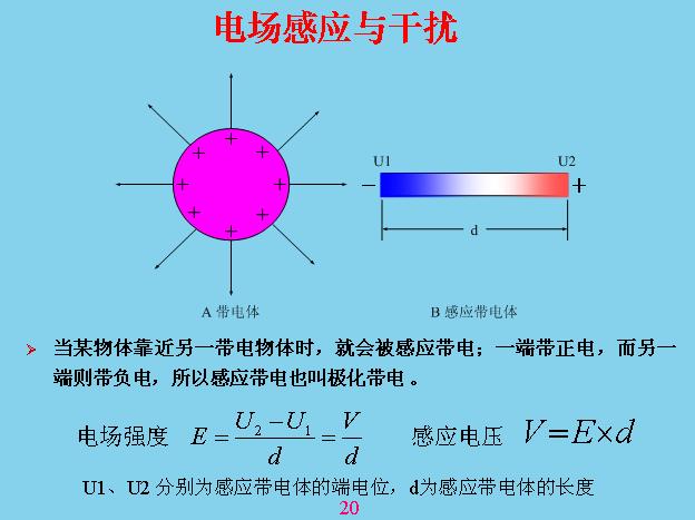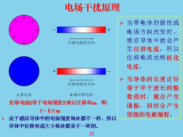 電磁干擾的原理是帶電體電磨和位能不斷的改變,會對感應(yīng)體產(chǎn)生位移電流,當(dāng)這邊是正的時候,電流的方向往這邊流,當(dāng)是負(fù)的時候電流往另外一邊流。位移電流和一般電工學(xué)里面的位移電流不一樣,位移電流不需要回路,在任何一個導(dǎo)體里面都會產(chǎn)生位移電流,并且位移電流的大小在這個導(dǎo)體里面的每個地方都不一樣,不管這個怎么變化,中間位移電流等于零,只在兩端位移電流是最的大,中間那個地方等于零。如果你不好理解,你把這個當(dāng)成一根天線就理解了,天線發(fā)射電磁波的時候也是沒有回路的,就是靠不斷的對它進(jìn)行充放電,這個原理是一樣的。還有一種情況,當(dāng)兩個變換的速度和來回移動的方向、距離正好是半個波長的時候它會產(chǎn)生諧振,這個在天線理論里面可以學(xué)到。因為位移電流是有速度的,不能說速度等于無窮大,我這邊變你也變,如果移動有速度就會產(chǎn)生疊加和抵消的作用,就會產(chǎn)生諧振。
