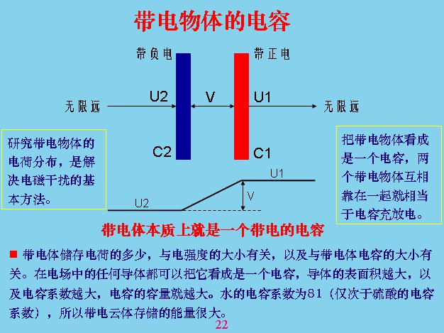 我們給大家介紹一個很重要的概念,就是電容。這個電容和我們現(xiàn)在電路里面用的電容是兩個概念,大家不要混淆。任何帶電體我們都可以把它看成一個電容,電容的大小跟它帶的電壓和電荷的多少有關(guān),如果帶的電荷越多,電壓越高它的電流就越大。電容的概念其實(shí)與電荷的概念也是互相對應(yīng)的,我們把這個電容器看成是兩個電容進(jìn)行串聯(lián),也就是說帶電體帶正電,帶正電是對于無限遠(yuǎn)的地方來說的,為什么呢?因為這個帶電以后電場分布是發(fā)散性的,中間這一點(diǎn)是最強(qiáng),離的越遠(yuǎn)的時候電感強(qiáng)度就越來越低,當(dāng)無限遠(yuǎn)的時候就等于零,你不能拿它來參考地球,參考地球的話相當(dāng)于范圍太小,本身地球也可以看成電容,所以分析電容的時候最好用無限遠(yuǎn)的地方作為參考點(diǎn)。也就是說我們計算電容的時候以無限遠(yuǎn)的地方考慮,計算電容也是以無限遠(yuǎn)的地方考慮。把這兩個電容靠在一起的時候就變成了電容器,你就可以利用這兩個電容的電位梯度和電容器來分析。任何一個帶電體都可以看成一個電容,一個孤立球?qū)w的電容等于表面積除以半徑,再乘以電容系數(shù)。地球的容量算出來就是7×10-4(F),把兩個孤立電容進(jìn)行推導(dǎo),算出來就是這樣,電容器正好等于上面儲存的電容量除以電位差。明白電容的概念以后,也要分析電路的電磁感應(yīng)方面,要有量的概念。有了量的概念我們可以對電磁干擾進(jìn)行分析,比如說這邊是一個干擾電壓,通過這條電路進(jìn)行供電,旁邊也有一個電路,這個電路就會受到干擾,干擾怎么計算?它的導(dǎo)向電路是什么?我們可以把兩個導(dǎo)線看成一個電容器,就是有一個耦合電容。等效電路相當(dāng)于這邊,你要減少兩個回路互相干擾的程度就必須要減少上面的Cm電容,把兩條線隔得越遠(yuǎn)越好,而且越短越好,只要面積越小電容器越小,離得越遠(yuǎn)電容器也越小。