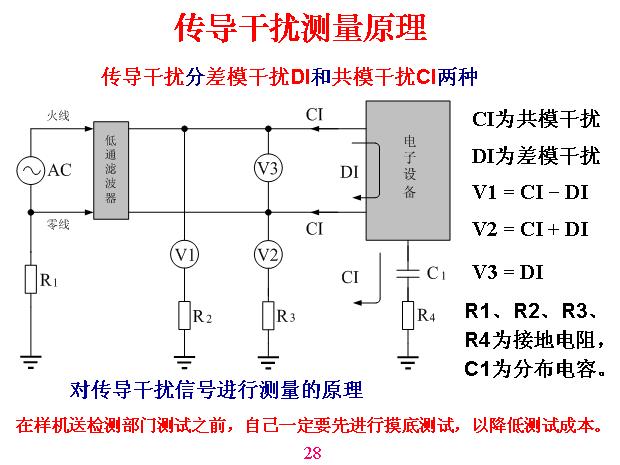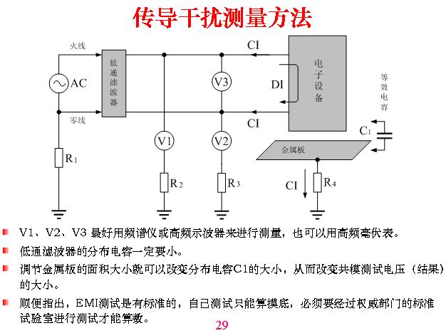 傳導(dǎo)干擾測量原理。這里面?zhèn)鲗?dǎo)干擾有兩個干擾,一個是共模,一個是差模,這樣一個回路是流進(jìn)入又流出來的,這叫做差模。這兩個同時進(jìn)去從另外一邊流出來叫共模,共模干擾很簡單,就是以大地為一端,另外一端是以上面的線路、設(shè)備,不管什么線為一端測到的電壓,這叫做共模干擾。因為測量的時候必須要與一根電路連接,先測三個電壓,這是測這個與大地之間的電壓,這是測兩條線之間的電壓,然后得出結(jié)算公式。V1=CI-DI,就是共模干擾減去差模干擾。V2=CI+DI,V3=DI,R1、R2、R3、R4為接地電阻,C1為分布電容,如果到檢測所去測之前自己一定要先進(jìn)行摸底測試,用一塊墊板或金屬板放在下面接地,等于說分布是固定的,利用標(biāo)準(zhǔn)一塊板與機(jī)器造成分布電容,一般是一個平方米等等,是由他們定的,你可以做試驗,測多大都沒有關(guān)系,但它是固定的,測電視機(jī)是什么樣,測手機(jī)是什么樣,這是不一樣的。傳導(dǎo)干擾測量方法。分布電容在這一塊金屬板,與它之間產(chǎn)生分布電容,當(dāng)然用這個板帶分布電容,測出來的結(jié)果數(shù)字越大,這只是用來做對比,以此為基礎(chǔ)。我們做摸底可以用大一點(diǎn)測,容易測得到,但你測得不算數(shù)。