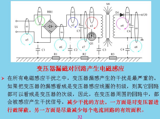 這個更加具體,有電力穿過的時候會產(chǎn)生電力線,電力線會產(chǎn)生共模干擾,這幾個都是共模干擾,那些都是差模干擾。這些干擾主要是如何產(chǎn)生的?本身線路里面只有電流流過,構(gòu)成一個線圈或?qū)Ь€都會產(chǎn)生干擾,最大的是變壓器漏感,這是其他回路的好幾十倍。所以變壓器漏感最好進(jìn)行屏蔽?怎么屏蔽呢?在線圈的外邊用一層金屬,鋁片也好,銅片也好,一般用銅片包起來,包起來應(yīng)該讓它短路,就是用焊絲焊起來,漏感在上面也會產(chǎn)生渦流,一產(chǎn)生渦流就會產(chǎn)生抵消干擾的磁場,就相當(dāng)于把漏感抵消掉。