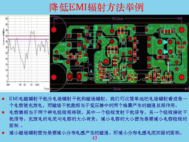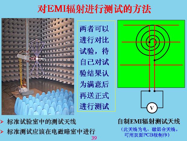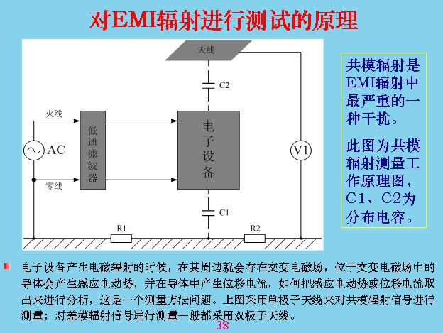 另外對于輻射干擾,我們最注意的就是共模干擾,差模干擾相對來說比共模干擾小很多,我們做過一個試驗,在同一個導(dǎo)線里面流過的電容,相差的共模干擾是2500倍。上面就是對輻射進(jìn)行測試,剛才是共模干擾,其他都是傳導(dǎo)測試,其實(shí)就是輻射干擾測試,一般就是用天線來測,天線的測試原理就是這樣的,量天線和大地之間的電壓,這個設(shè)備與大地之間有分布電容,前面已經(jīng)說過了,放這個在上面,與板接地產(chǎn)生分布電容。天線也有分布電容,分布電容不是跟設(shè)備大小和距離有關(guān),所以測試的時候都有一個標(biāo)準(zhǔn),固定設(shè)備中間距離有多遠(yuǎn),天線面積用多大,還有一套天線,很多天線,不只是一個,計最大的那個,就是測試電壓最大的那個,天線對輻射會產(chǎn)生諧振。
