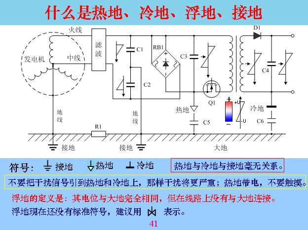 我們后面再講很具體的電路問題。很多人對地的概念不是很清楚,也不了解,現(xiàn)在很多人都把電路里面的公共關(guān)說成地,具體是不是?我們先介紹幾個概念。一般按照道理,最早地就是大地,后來地慢慢習(xí)慣用到設(shè)備里面,包括外殼、輸入線,比如說示波器或者信號線,與大地連在一起,有的不連,現(xiàn)在就變成了一個很模糊的概念,我們就把熱地、冷地、浮地、接地幾個概念簡單介紹一下。這個符號是比較標(biāo)準(zhǔn)的接地符號,就是接大地的,不管哪個設(shè)備接地都是這個符號。熱地國家還沒有標(biāo)準(zhǔn),大部分都習(xí)慣用這個箭頭作為熱地。冷地國家也沒有標(biāo)準(zhǔn),大家都接受是這樣的,這三個地基本上電工里面都有明確定義的,這個地就是接大地,熱地就是里面整流出來電源的某一端是公共端,人去摸它會帶電,會電死人,和前面的火線會產(chǎn)生回路電流,會電到人,所以這個叫做熱地。還有一個通過電子耦合以后沒有電的關(guān)聯(lián),只有磁場關(guān)聯(lián),你去量根本沒有回路,叫做冷地,手是可以摸的。但是你不要以為它是冷地就不帶電,實(shí)際上它還是帶電,為什么帶電?大家可能一下子不是很清楚,它帶的是靜電,相當(dāng)于極化帶電,就是線圈通過感應(yīng)以后,一頭帶負(fù)的,一頭帶正的。電容機(jī)也是,有一頭帶電,有一頭不帶電,這一點(diǎn)還是帶負(fù)電,不帶電的沒有跟電路連接,定位與大地一樣,所以叫做浮地。對應(yīng)的不是與大地相等,但沒有與大地連接,拿電表來量這一點(diǎn)與大地沒有電壓。浮地的信號現(xiàn)在還沒有,如果大家參考的話可以參加這個符號來用,這個地方電位等于零,當(dāng)兩邊發(fā)生變化就用這個來表,對電路分析有好處,特別是嚴(yán)重干擾的時候一定要把浮地找到,因為電位越高的地方電容越容易干擾,電位等于零,也就是浮地和電位是越低的地方干擾就越小。