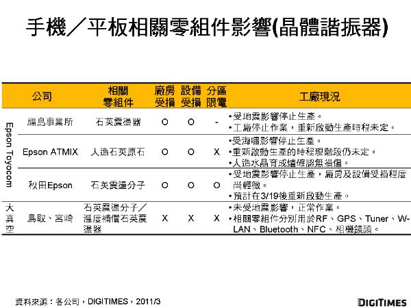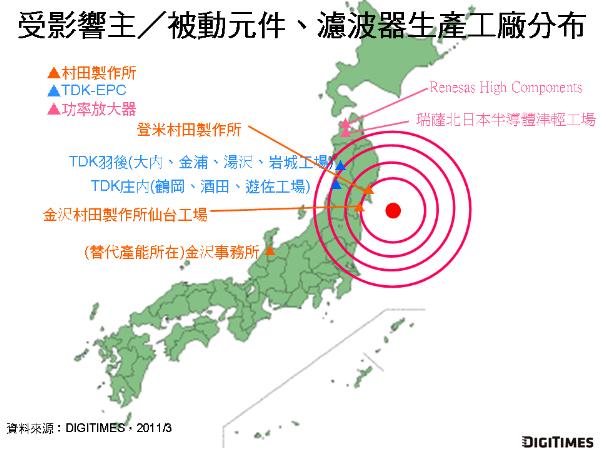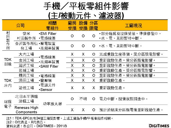 DIGITIMES Research最新報告指出,日本311強震造成日廠手機/平板相關(guān)零組件供應(yīng)商分別遭受廠房、設(shè)備損壞,亦或海嘯沖擊、地方分區(qū)限電等影響,工廠作業(yè)停擺,影響超過20處工廠,在災(zāi)后截至2011年3月16日仍未能正常作業(yè)。