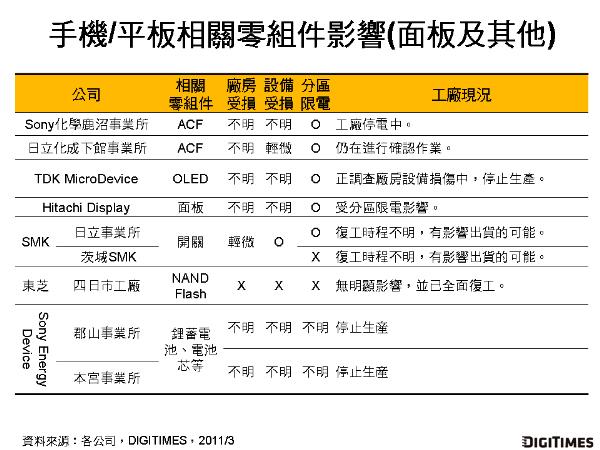 在面板、開關(guān)、存儲器、電池芯、異方性導(dǎo)電膜(ACF)等手機/平板相關(guān)零組件方面,除東芝位于四日市生產(chǎn)NAND Flash的工廠未受到日本311地震沖擊,其余包含TDK、日立顯示、日立化成、SMK、Sony化學(xué)、Sony Energy Device等業(yè)者的生產(chǎn)工廠,分別受到廠房、設(shè)備受損或停止生產(chǎn)的大小不等的影響。