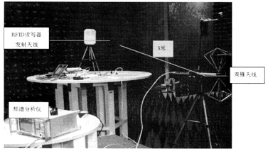 我們針對UHF頻段的相關已存在的業務進行了RFID設備的兼容性測試(RFID讀寫器樣品帶外雜散發射測試圖樣例見圖2),由于標簽相對讀寫器來說功率較小,測試主要考慮讀寫器對公眾蜂窩通信的影響,特別是對易發生鄰頻干擾的GSM網絡。對無中心對講機系統也進行了相關的實驗室環境干擾測試。我們所使用的測試環境為EMC10米法半電波暗室、5米法全電波暗室,以及相關的真實環境。實驗室測試配置如圖3所示。