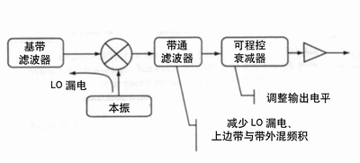 為了解決信號發生器的需求,一個上變頻器將信號從1.1GHz~2.2GHz頻帶變換至4.9GHz~6GHz頻帶。表2列出了上變頻器的兩種技術。同樣,我們選擇基本混頻方案。上變頻器的方框圖基本上和下變頻器類似,只是作些變更以適應輸入頻率低于輸出頻率(圖2)。同樣可以用2dB衰減器來改善混頻器每個端口的匹配度。用相同的混頻器和開關來提供變頻或直通性能。上邊帶由輸出級的帶通濾波器除去,最終的輸出電平用可程控衰減器進行高速調整,為了便于觀察,針對頻譜倒置的校正是必不可少的。