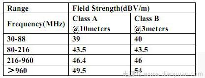 EMI測試是在特定的電波暗室中進行的,測量由產品中輻射出來的電磁波強度,與FCC等規范相比較,不得超過規定的最大能量。FCC規范中將產品按用途分為CLASS A 、CLASS B 兩大類,A 類為用于商務或工業用途的產品,B 類為用于家庭用途的產品, FCC 對 B 類產品法規要求更嚴格。下表顯示的是FCC 規范的CLASS A和CLASS B標準: