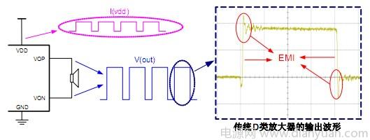 傳統D類放大器開關輸出的拓撲結構是一個很好的EMI發射源:如調制的開關信號,開關信號的邊沿變化,電源線上變化的電流信號等都會產生大量的EMI,如下圖所示。