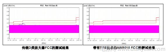下面是傳統D類放大器和帶有EEE技術的AW8010的EMI測試結果,測試使用60cm(24inch)的輸出線。上面的紅色實線是FCC CLASS B的標準線,紅色虛線是-6dB的裕量線,藍色的線是實際測試曲線,粉色的線是測試環境的EMI背景噪音。