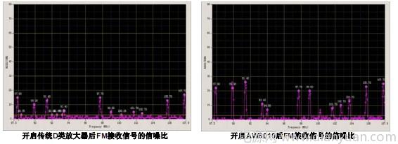 下圖是傳統D類放大器和帶EEE技術的AW8010對FM接收信號的信噪比影響。傳統D類放大器對FM的影響很嚴重,信號變差甚至丟臺,而帶EEE技術的AW8010對FM影響很小,降低了系統工程師的調試難度。