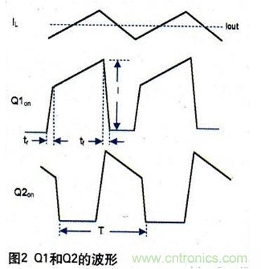 當(dāng)Q1關(guān)斷、Q2導(dǎo)通時(shí),就形成了第二個(gè)回路。之后存儲(chǔ)在L1內(nèi)的能量流經(jīng)輸出電容器和Q2,如圖5所示。這些回路面積控制對(duì)于降低電磁干擾是很重要的,在PCB走線布線時(shí)就要預(yù)先考慮清器件的布局問題。當(dāng)然,回路面積能做到多小也是有實(shí)際限制的。