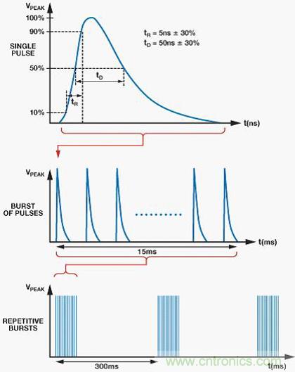 電快速瞬變測試要求將數個極端快速的瞬變脈沖耦合到信號線上,以代表容性耦合到通信端口的外部開關電路的瞬態干擾,這種干擾可能包括繼電器和開關觸點抖動,以及切換感性或容性負載引起的瞬變,所有這些在工業環境中非常常見。EC 61000-4-4中定義的EFT測試嘗試模擬因為這些類型的事件產生的干擾。