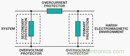 圖5顯示一個典型保護方案,其特征是具有兩重保護:主保護和次級保護。主保護可將大部分瞬變能量從系統轉移開,通常位于系統和環境之間的接口。它旨在將瞬變分流至地,從而消除大部分能量。