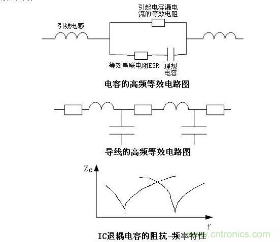 電容,在中低頻或直流情況下,就是一個儲能組件,只表現(xiàn)為一個電容的特性,但在高頻情況下,它就不僅僅是個電容了,它有一個理想電容的特性,有漏電流(在高頻等效電路上表現(xiàn)為R),有引線電感,還在導致電壓脈沖波動情況下發(fā)熱的ESR(等效串聯(lián)電阻),(如圖)。從這個圖上分析,能幫我們設(shè)計師得出很多有益的設(shè)計思路。第一,按照常規(guī)思路,1/2πfc是電容的容抗,應該是頻率越高,容抗越小,濾波效果越好,即越高頻的雜波越容易被泄放掉,但事實并非如此,因為引線電感的存在,一支電容僅僅在其1/2πfc=2πf L等式成立的時候,才是整體阻抗最小的時候,濾波效果才最好,頻率高了低了都會濾波效果下降,由此就可以分析出結(jié)論,為什么在IC的VCC端都會加兩支電容,一支電解的,一支瓷片的,并且容值一般相差100倍以上多一點。就是兩支不同的電容的諧振頻率點岔開了一段距離,既利于對稍高頻的濾波,也利于對較低頻的濾波。
