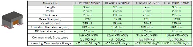 作為DLW43SH系列的小型化產品,DLW32SH系列目前正在開發中。該系列的外觀以及主要特性如圖3所示。DLW32SH系列的尺寸為3.2×2.5×2.3mm具有小尺寸特點,并且與DLW43SH系列相比,可實現同等性能。其構造的特征是在產品端子部分使用了金屬支架,可以緩和由于溫度變化產生的熱伸縮影響,適用的溫度范圍達到了-55~+150℃。
