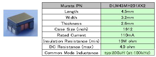 此外,村田公司目前正在開發作為車載Ethernet用共模扼流圈的DLW43MH系列。該產品的外觀以及主要特性如圖4所示。DLW43MH系列的尺寸和DLW43SH系列同為4.5×3.2×2.6mm,共模電感值提高到了200μH,因此在較寬的頻帶中能起到有效的噪聲對策效果。由于在繞線上下足了功夫并且改善了共模轉差模噪聲,因此噪聲改善效果會更加好。