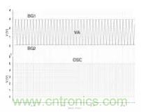 由圖1可以看出,頻率抖動振蕩器由一個張弛振蕩器加上一個頻率抖動模塊構成。其工作原理:首先,開關 S1閉合,電流源 I0給電容 Cc充電,充電剛開始時電容 Cc上極板的電壓小于 BG1和 BG2,RS 觸發器的輸出被置為低電平 0,當電容上極板電壓 VA大于 BG2時,RS 觸發器的輸出狀態處于保持狀態,直到上極板電壓 VA大于 BG1之后 RS 觸發器的輸出翻轉被置為高電平1;此時,開關 S2導通,電流源 I1給電容Cc放電,當VA減小到小于 BG1時,RS 觸發器的輸出處于保持狀態,當VA減小到小于 BG2時,RS 觸發器翻轉被置為低電平 0 ;于是,開關 S1又閉合開始對 Cc充電,如此周而復始,得到一個頻率固定的振蕩器。圖1中的電流源I0、 I1的電流相等,則振蕩器的占空比為 0.5。頻率抖動控制模塊是通過計數器來周期性的切換加入到張弛振蕩器中充放電電容的大小,改變電壓 VA的充放電速度,從而來達到周期性的改變振蕩器頻率的目的,即實現了振蕩器頻率的抖動。