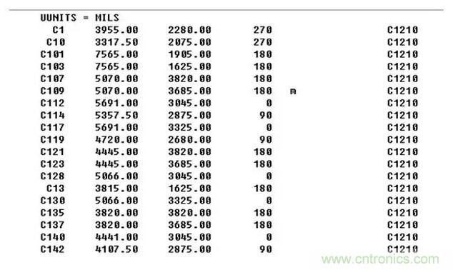 大家可以清晰可以的看到第一行表示的是單位mil。第一列是器件位號(hào),第二列是X軸坐標(biāo),第三列是Y軸坐標(biāo),第四列是旋轉(zhuǎn)度數(shù),第五列是表示器件放在top面(空白)或者bottom面(m-Mirror的縮寫(xiě)),第六列是器件封裝名。對(duì)于一個(gè)器件的定位信息來(lái)說(shuō),直接 感覺(jué)一下,似乎我們只需知道是哪個(gè)器件也就是器件位號(hào),放置在哪一面,也就是在表面還是底面,旋轉(zhuǎn)度數(shù)以及具體的xy坐標(biāo),信息就全了。對(duì)于是哪種封裝類型似乎不是必需的,那么說(shuō)到這,我想大家也就明白在遇到上述情況時(shí),可以進(jìn)行一些更為簡(jiǎn)單的操作了。