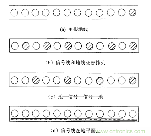 在設計的時候,也考慮過使用(b)信號線和地線交替排列和(c)地線—信號線—信號線—地線這兩種結構。圖(b)是一個較好的配置,因為每根導線都緊挨著一個分離的地線,這種排列結構帶來的好處就是,環路面積很小,公共阻抗耦合被消除額,并且所有導線之間的串擾被減到最小。