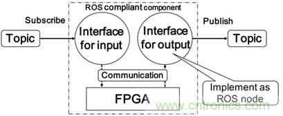 Rosbridge為ROS與FPGA的聯(lián)通提供了一種溝通機(jī)制,但是在這種機(jī)制中,ROS Node并不能運(yùn)行在FPGA上,而且通過JSON API的連接機(jī)制也帶來了一定的性能損耗。為了讓FPGA與ROS更好的耦合,最近日本的研究人員提出了ROS-Compliant FPGA的設(shè)計,讓ROS Node可以直接運(yùn)行在FPGA上。如圖10所示,在這個設(shè)計中,F(xiàn)PGA了實現(xiàn)一個輸入的接口,這個接口可以直接訂閱ROS的topic,使數(shù)據(jù)可以無縫連接流入FPGA計算單元中。另外,F(xiàn)PGA上也實現(xiàn)了一個輸出接口, 讓FPGA上的ROS Node可以直接發(fā)表數(shù)據(jù),讓訂閱這個topic的其他ROS Node可以直接使用FPGA產(chǎn)出的數(shù)據(jù)。在這個設(shè)計中,開發(fā)者只要把自己開發(fā)的FPGA計算器插入到ROS-compliant的FPGA框架中,便可以無縫連接其他ROS Node。