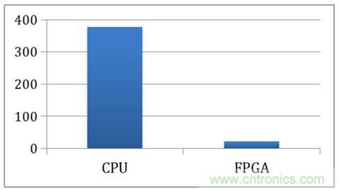 為了讓讀者了解FPGA對深度學(xué)習(xí)的加速以及節(jié)能,我們下面關(guān)注北京大學(xué)與加州大學(xué)的一個關(guān)于FPGA加速CNN算法的合作研究。圖7展示了FPGA與CPU在執(zhí)行CNN時的耗時對比。在運(yùn)行一次迭代時,使用CPU耗時375毫秒,而使用FPGA只耗時21毫秒,取得了18倍左右的加速比。假設(shè)如果這個CNN運(yùn)算是有實時要求,比如需要跟上相機(jī)幀率(33毫秒/幀),那么CPU就不可以達(dá)到計算要求,但是通過FPGA加速后,CNN計算就可以跟上相機(jī)幀率,對每一幀進(jìn)行分析。