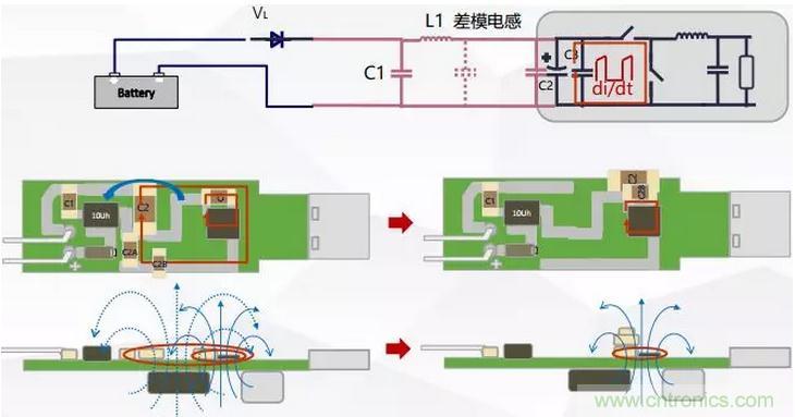 在功率開關回路中di/dt環路會產生磁場,并且磁場強度與電流和環路面積成正比關系。減小環路面積能大幅度減小對外輻射。如圖6所示通過將輸入電容C2靠近芯片可以顯著減小磁場輻射程度。
