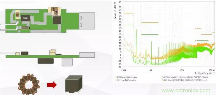 環形電感的漏磁較大,體積也比較大,對大地也有比較大的耦合電容,因此其對外的輻射更大,如圖8所示將環形電感替換為貼片電感后整體的EMI就會下降很多。