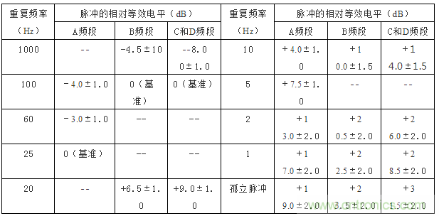 所謂相對脈沖特性指輸人周期性脈沖信號時,脈沖的重復(fù)頻率越高,其讀數(shù)越高,重復(fù)頻率低,讀數(shù)低。當讀數(shù)不變時輸人脈沖的幅度和重復(fù)頻率的關(guān)系應(yīng)符合表4的規(guī)定。