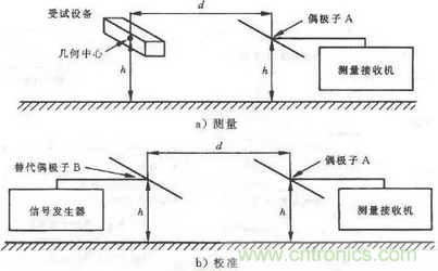 測試距離d雖然沒有明確要求,但最好還應(yīng)符合遠場條件。d的起始點為EUT的幾何中心,終止點為測量天線A的天線中心。替代試驗和校準試驗時,替代天線B應(yīng)置于EUT 的幾何中心。