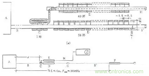 其中C是電流探頭,包括鐵氧體環和探測線圈,作用是測量電源線上的騷擾共模電流。D是鐵氧體環組,作為騷擾共模電流的穩定負載,吸收騷擾功率,并用于隔離EUT和電網。如果在50MHz以下鐵氧體環組D不能充分起到射頻隔離作用,則應在電網端再加一個輔助吸收鉗F,它也是由鐵氧體環組成。E也是鐵氧體環組,用于吸收外場在電流探頭引出電纜上產生的共模電流,以免影響測量結果。測量布置如圖19(b)所示,測試應在屏蔽室內進行,電源線長度應大于6m,即大于30MHz的半波長加上吸收鉗的長度。對于每一個測試頻率點,吸收鉗都應沿著電源線移動,找出最大值,因為共模電流在導線上是以駐波形式出現的。功率吸收鉗測量系統應事前進行校準,得到修正因子—頻率曲線。校準布置如圖20所示。