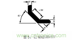 與過孔相似,直角的轉彎路徑應該被避免,因為它在內部的邊緣能產生集中的電場。該場能耦合較強噪聲到相鄰路徑,因此,當轉動路徑時全部的直角路徑應該采用45度。圖5是45度路徑的一般規則。