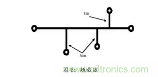 如圖6所示短截線會產生反射,同時也潛在增加輻射天線的可能。雖然短截線長度可能不是任何系統已知信號波長的四分之一整數,但是附帶的輻射可能在短截線上產生振蕩。因此,避免在傳送高頻率和敏感的信號路徑上使用短截線。
