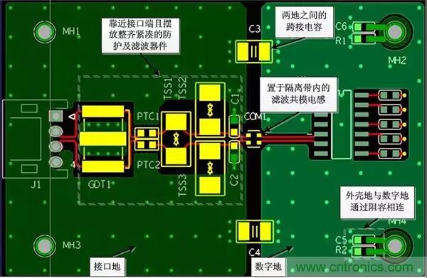 (2) 共模電感與跨接電容要置于隔離帶中。