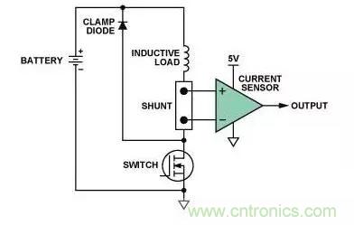 本例將詳細(xì)介紹一種典型的高端電流檢測(cè)應(yīng)用。圖1所示為汽車(chē)應(yīng)用環(huán)境中用于監(jiān)控電磁閥或其它感性負(fù)載的常見(jiàn)配置。