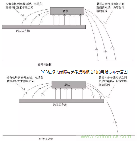 從圖中可以看出,當晶振布置在PCB中間,或離PUB邊緣較遠時,由于PCB中工作地(GND)平面的存在,使大部分的電場控制在晶振與工作地之間,即在PCB內部,分布到參考接地板去的電場大大減小,導致輻射發射就降低了。