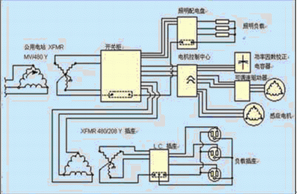圖1 商業和工業設施中典型的簡化配電系統。