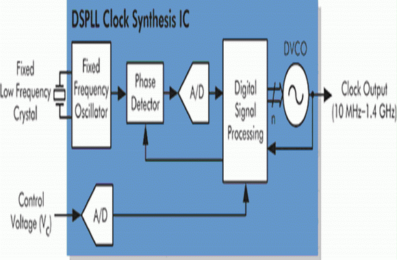 以DSP為基礎的鎖相回路技術(DSPLL)為振蕩器提供傳統(tǒng)設計無法實現(xiàn)的許多獨特功能。例如傳統(tǒng)做法須為不同頻率制造不同的HFF石英晶體或SAW諧振器,以DSPLL架構為基礎的振蕩器(圖1所示)則能在所有產(chǎn)品中利用一顆規(guī)格較寬松的低頻石英晶體提供多頻操作能力,并將固定頻率振蕩器的輸出倍頻為使用者在10MHz到1.4GHz之間所指定的頻率。