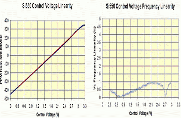 從圖4即可看出在控制電壓的線性方面,以DSPLL為基礎的振蕩器比現(xiàn)有的壓控石英振蕩器或壓控SAW振蕩器還好五倍。Si550會將控制電壓數(shù)字化,然后傳給DSPLL頻率合成引擎。這種做法可以免除傳統(tǒng)所需的變?nèi)萜骱退鶐淼姆蔷€性特性,進而提供高于其它競爭組件五到十倍的±1線性效能。Si550還提供多種控制范圍(tuning range)讓客戶選擇最適合其應用的組件;相較于采用SAW的解決方案,這種可選擇式控制斜率范圍在同樣的溫度范圍內(nèi)可以提供更穩(wěn)定的回路頻寬,進而使得設計更強固可靠。
