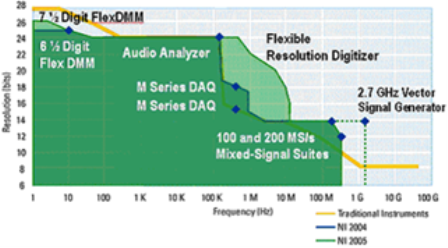 基本上,虛擬儀器系統(tǒng)是基于軟件的,所以如果只要是可以數字化的東西,就可以對它進行測量。因此,測量硬件可在通過兩根坐標軸進行評估,即分辨率(位)和頻率。參考下圖可以看出虛擬儀器硬件測量性能與傳統(tǒng)儀器的比較。NI的目標就是將曲線在頻率和分辨率上延伸并且在曲線內進行不斷推陳出新。