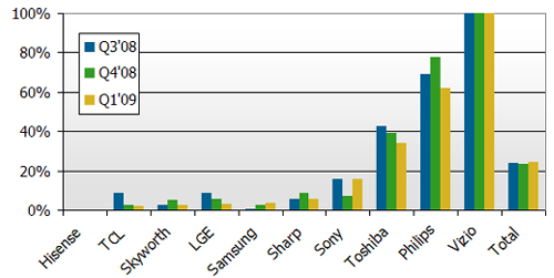 - 2009年第一季全球液晶電視外包比率達25%,較上一季成長1%