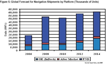 圖5所示為iSuppli公司對(duì)于OEM和配件市場(chǎng)的導(dǎo)航出貨量預(yù)測(cè)。