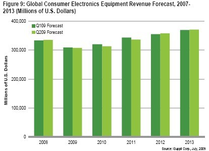 預(yù)計(jì)全球消費(fèi)電子營(yíng)收仍將下降8.2%,從2008年的3,350億美元下降到約3,080億美元。但iSuppli估計(jì)2010年市場(chǎng)將開(kāi)始復(fù)蘇,營(yíng)收將增長(zhǎng)2%,達(dá)到3,140億美元。預(yù)計(jì)未來(lái)五年將實(shí)現(xiàn)持續(xù)增長(zhǎng),到2013年達(dá)到3,700億美元。