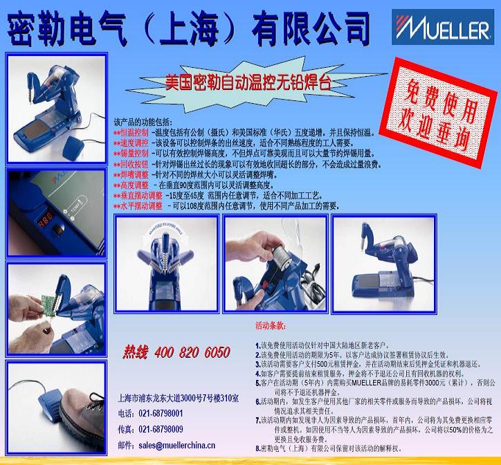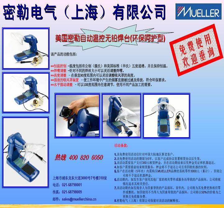Mueller公司創新的推出自動溫控無鉛焊臺免費使用活動,此次活動包含兩款產品,都是Mueller公司廣受客戶歡迎的產品。產品的功能包括:恒溫控制、焊嘴調整、高度調整、強效的吸風罩裝置、水平擺動調整等功能……