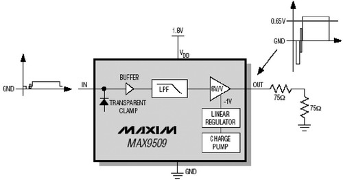當(dāng)視頻濾波放大器采用1.8V電源電壓工作時,必須采用DirectDrive技術(shù)。采用電壓模式輸出級的放大器必須至少提供2VP-P擺幅,才能輸出復(fù)合視頻信號。傳統(tǒng)的放大器采用1.8V單電源供電時,沒有足夠的余量產(chǎn)生2VP-P輸出信號。而采用DirectDrive后,集成反向電荷泵將產(chǎn)生一個嘈雜的-1.8V電壓;負(fù)電壓線性穩(wěn)壓器將-1.8V電壓穩(wěn)定到-1V,降低了電荷泵噪聲。因此,實際采用-1V~+1.8V的電壓供電時,MAX9509剛好有足夠的余量輸出2VP-P視頻信號。