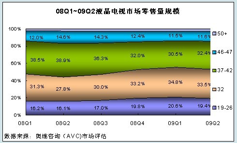 受終端售價快速下降至3000元以內及家電下鄉政策因素的拉動,32英寸及以下規格在LCD零售內部比重顯著提升;40/46陣營受42vs40和47vs46均價傾壓及上游面板廠供銷策略的影響,在一季度銷量比重有所下降,二季度比重有所提升。