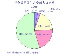 圖1:2008年金磚四國占全球人口比重。數(shù)據(jù)來源:中國國家統(tǒng)計(jì)局,聯(lián)合國人口基金會(huì)