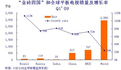 - 2009年1季度,金磚四國平板電視銷量為747萬臺(tái),占同期全球市場的25%